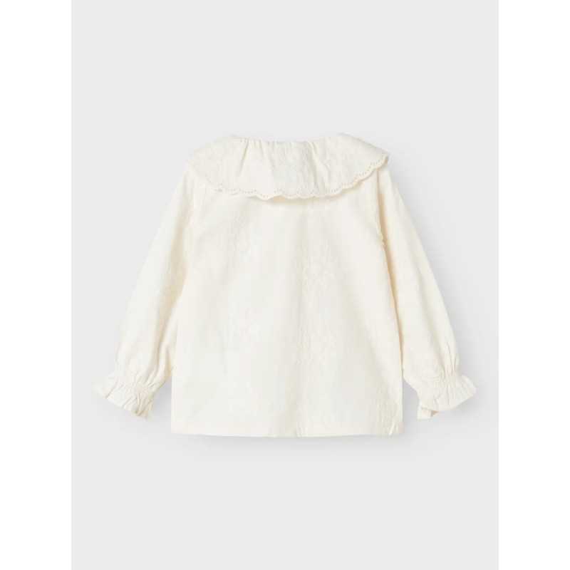 Scopri la camicia per bambina in cotone, arricchita da eleganti fiori ricamati. Il colletto ampio con pizzo leggero e i polsini con rouches offrono un comfort senza pari e uno stile raffinato, perfetto per ogni occasione speciale.