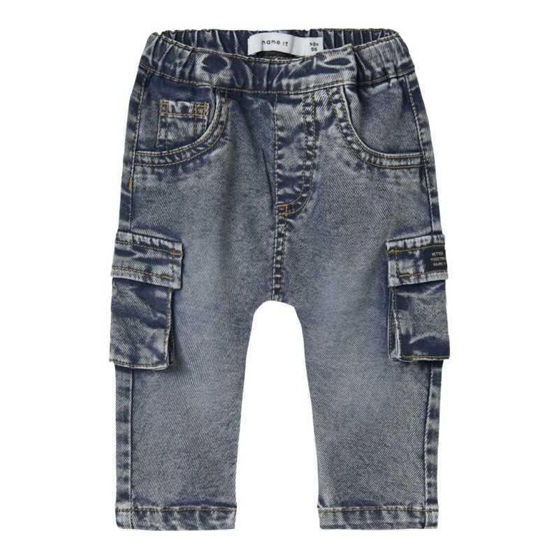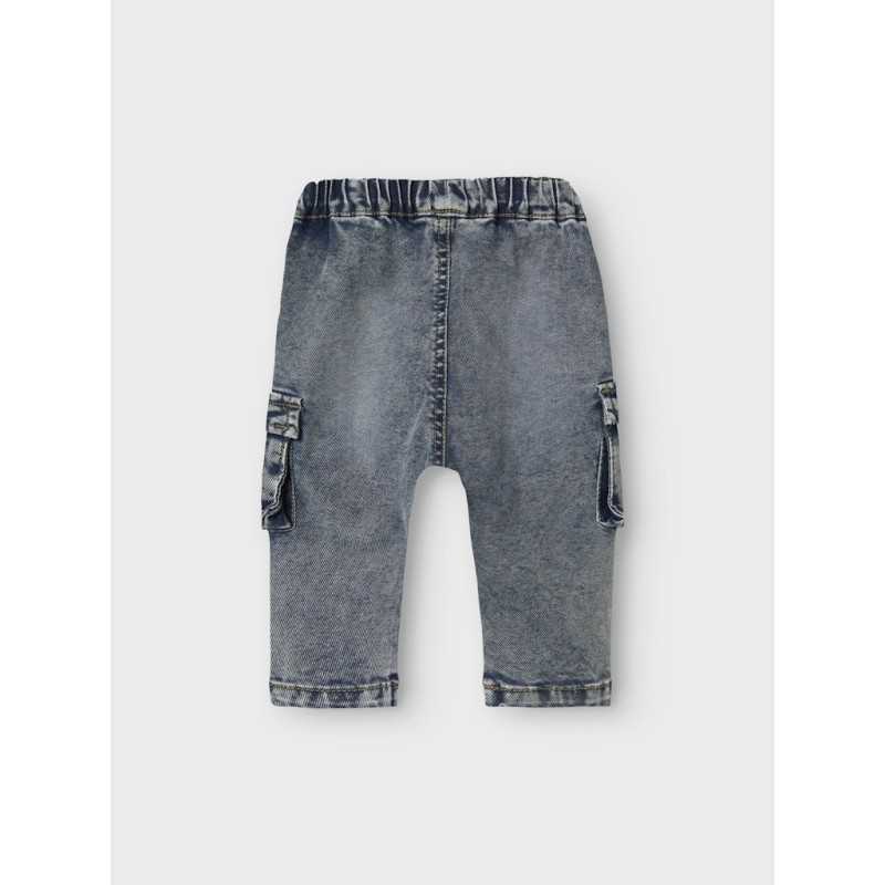 Jeans neonato stretch modello cargo, cinto elastico regolabile, tessuto morbido sulla pelle.