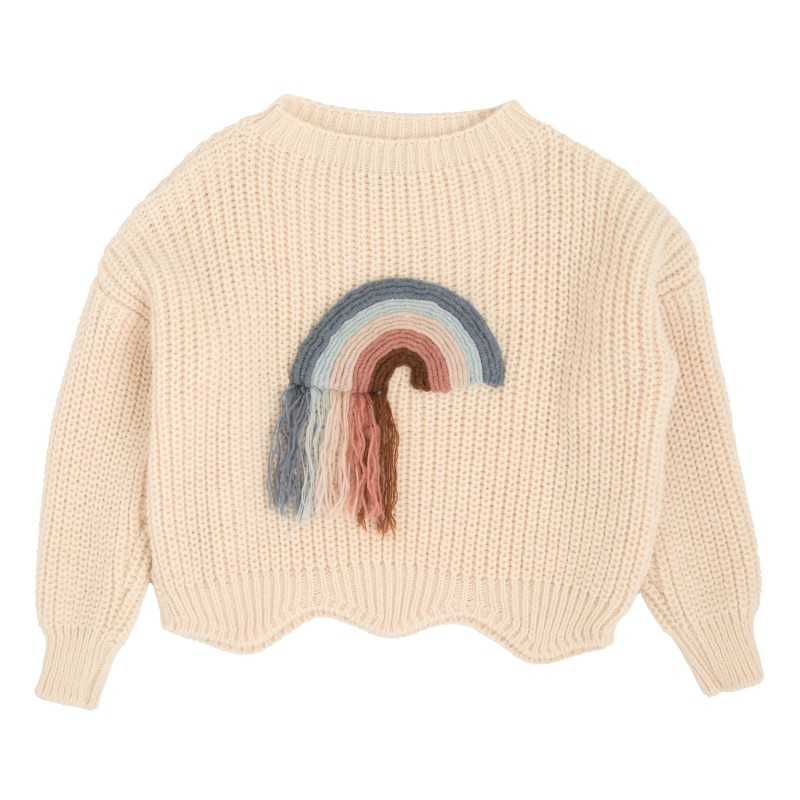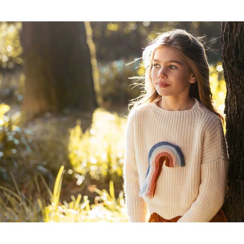 Maglioncino arcobaleno Magil Maglioncino da bambina modello crop, in misto lana e alpaca, con arcobaleno ricamato e sfrangiato.