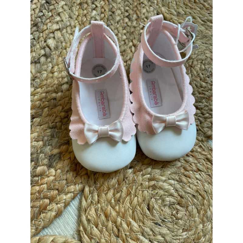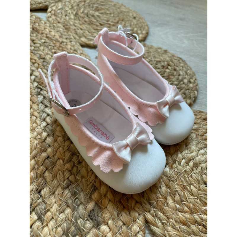 Scarpette culla bimba in ecopelle, con braccialetto e inserti in nabuck color rosa e fiocchetto in raso.