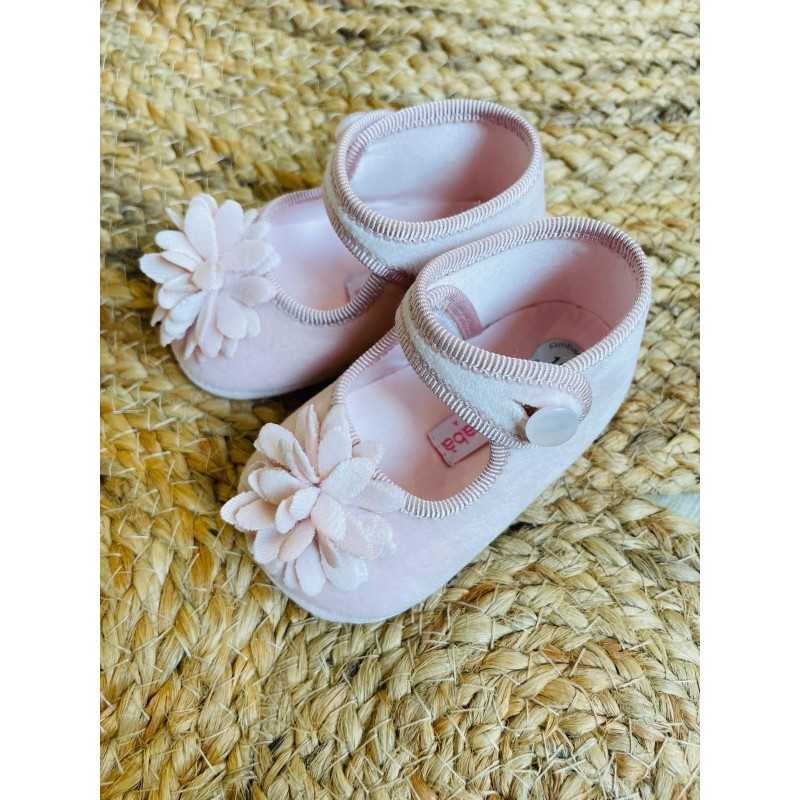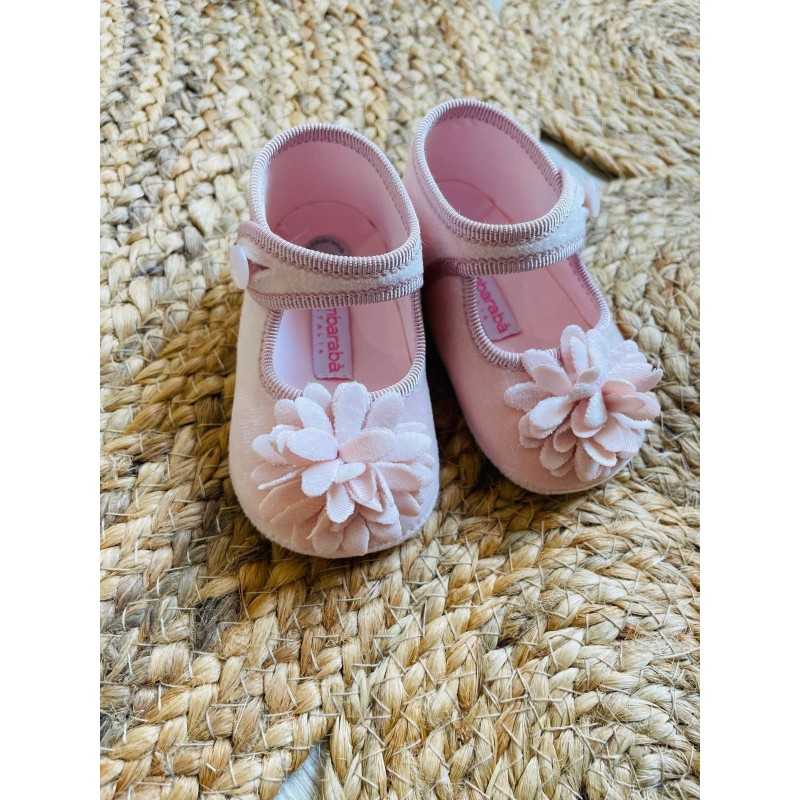 Scarpette culla Ambarabà velluto Scarpette culla bimba, in vellutino, braccialetto con bottoncino e fiore sul davanti.