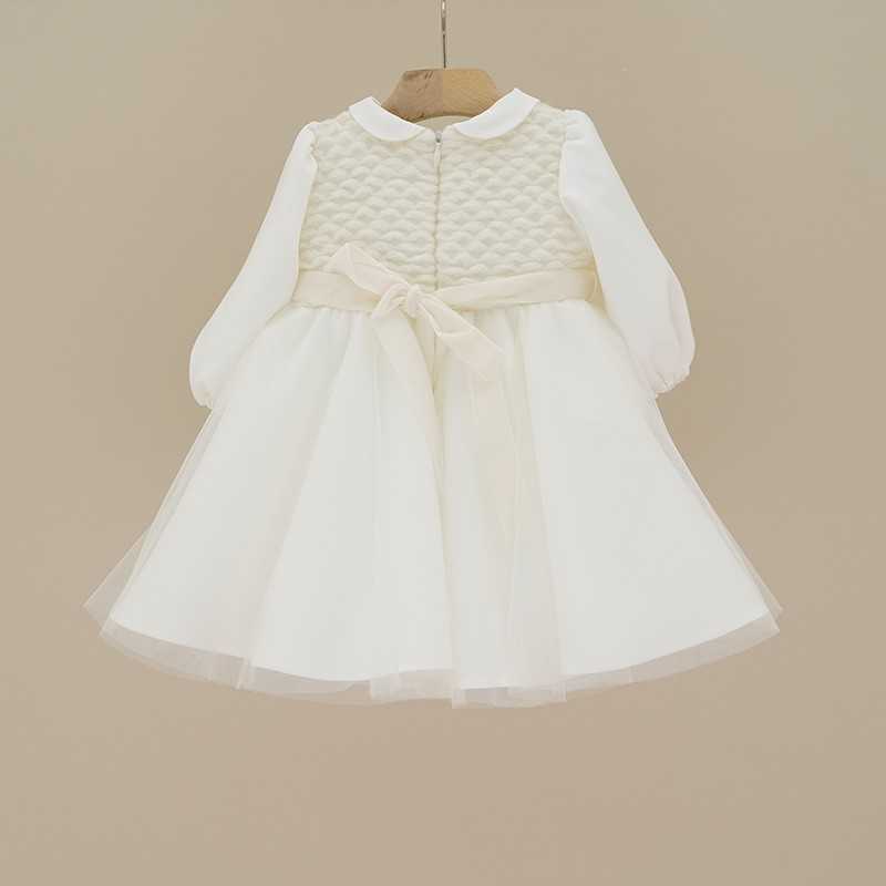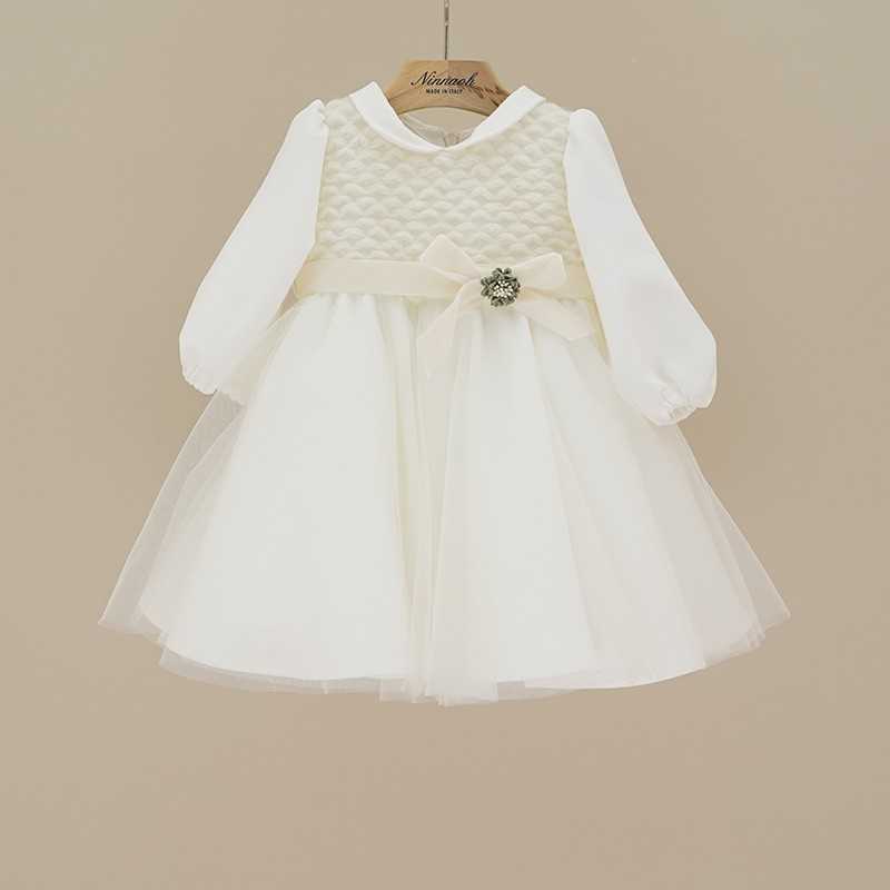 Abito battesimo da neonata manica lunga in crepe, corpino lavorato in maglia e cinturina in velluto con fiorellino verde salvia, colletto tondo e gonna ricoperta in tulle.