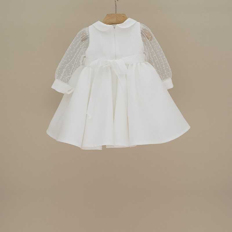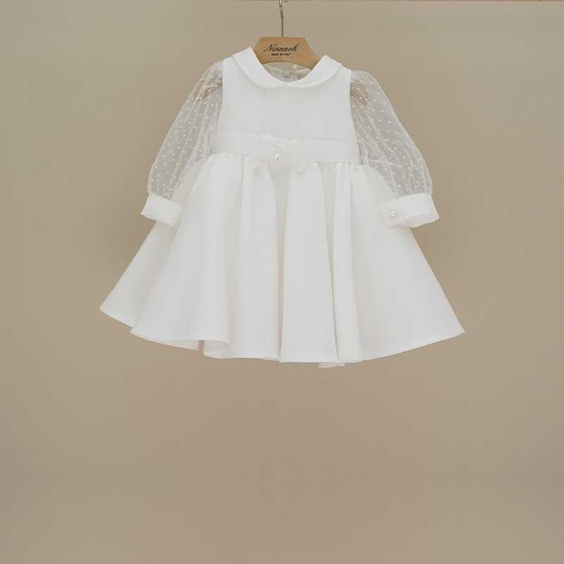 Abito battesimale bimba, manica e corpino in tulle a pois, con colletto e fiocchetto in gros in vita.