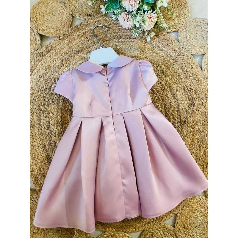 Scopri l'eleganza dell'abito da bambina in raso a manica corta, con colletto tondo e spilla floreale in voile. Un capo raffinato e confortevole, perfetto per le grandi occasioni.