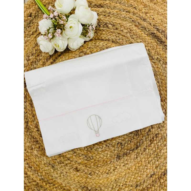 Set lenzuola mongolfiera Marlù cotone Set lenzuola da neonato/a in puro cotone, con ricamo mongolfiera e nuvolette, composto da: