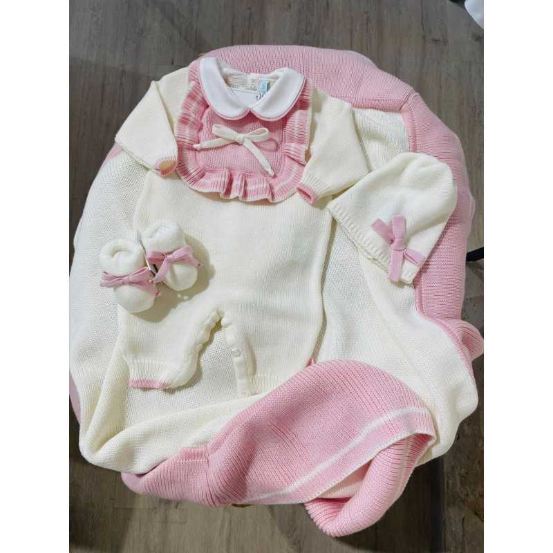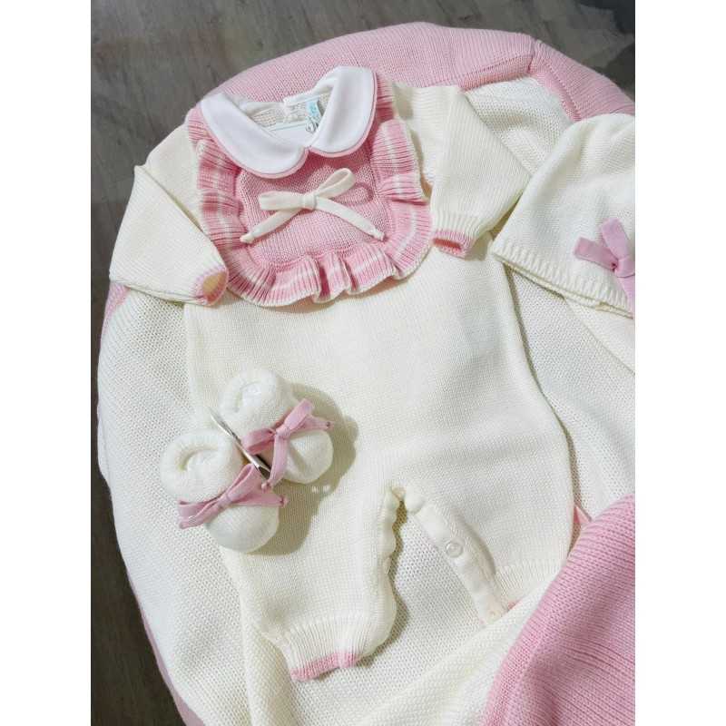 Tutina in pura lana merino extrafine con rouches e fiocchetto sul davanti , cappellino e babbucce in lana coordinate.