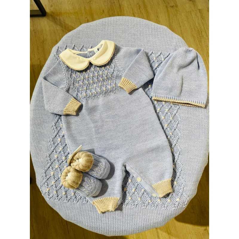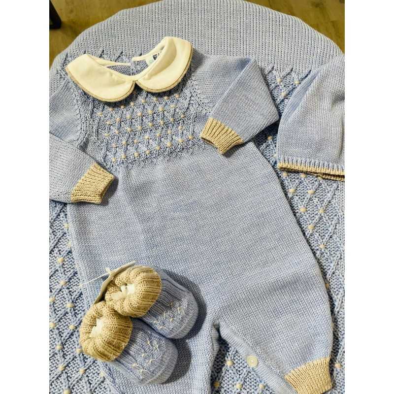 Tutina neonato in pura lana merino extrafine con punto smock , con babbucce e cappellino coordinati