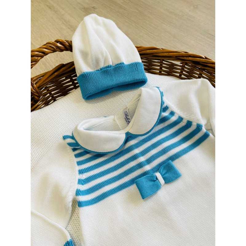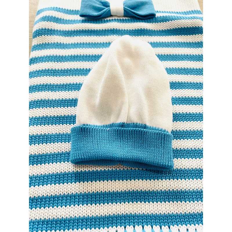 Cappellino neonato in puro filo di cotone, con risvolto azzurro.